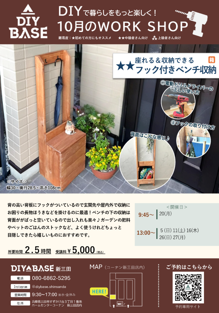 10月の作り甲斐のある大物、「フック付きベンチ収納」が登場です✨️